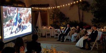 Package includes a projector screen, ultra short throw projector, and media player for displaying your photo or video slideshow. Simply provide your file.